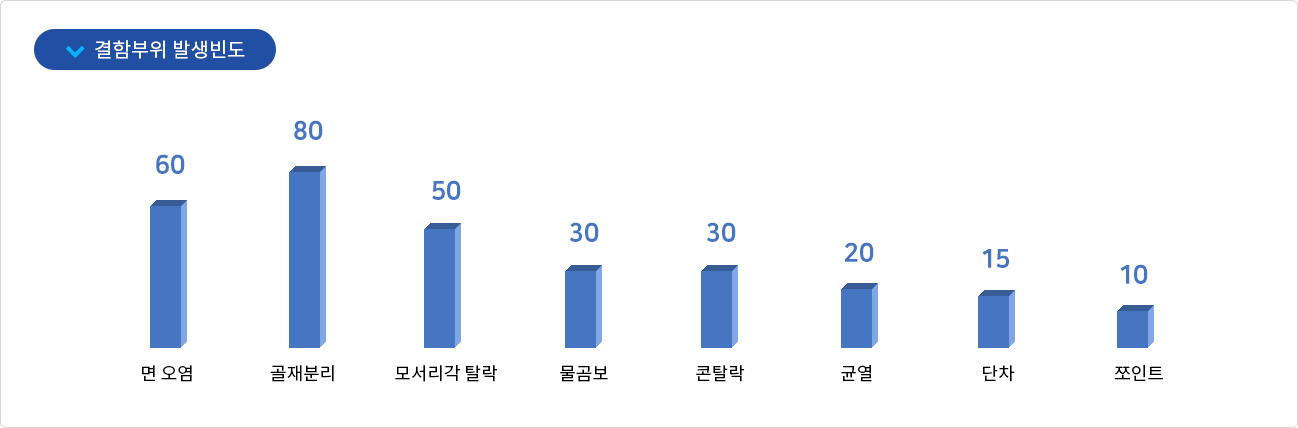 노출콘크리트는 관리소홀과 경험부족으로 시공미숙함과 여러가지 원인으로 인하여 면 오염, 골재분리, 모서리각 등 다양한 형태로 결함이 발생된다. 노출콘크리트 결함을 최소화 하기 위해서는 설계단계부터 조직적인 관리가 필요시되며 콘크리트 철근 거푸집 조합, 제조 타설 운반 신중함이 요구시되며 소홀히하면 반듯이 결함부위가 발생하게된다. 노출콘크리트 시공후 발생되는 결함부위 발생빈도를 그래프로 나타내면 다음과 같다 .